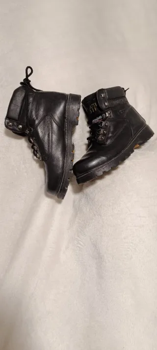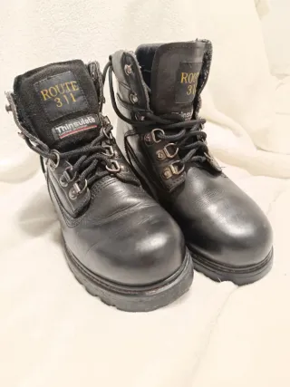 Pac boots de cuero estética americana, super robustas compradas en un viaje por la América rural. Son de cuero al aceite (muy flexibles). Resistentes al agua. Muy calientes y aislantes con tecnología Thinsulate. Están en muy buen estado en general quitando que tienen un pequeño roce que al ser negras se ve poco la verdad, pero pongo fotos del tamaño. Y bueno ya para los muy tiquismiquis; la típicas arrugas que salen cuando estrenas una bota, también un poco, muy poco de oxido en alguna hebilla y alguna bolilla en el interior