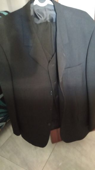 Traje hombre tres piezas. Chaqueta, chaleco y pantalón. Usado una sola vez. Color gris oscuro. Talla 56. La chaqueta mide 50 cm. de hombros, y el pantalón mide 48 cm. de cintura.