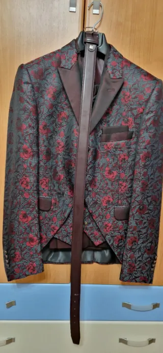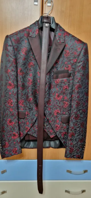 Traje de novio de la marca Enzo Romano con un diseño floral en tonos rojos y negros. Incluye chaleco y cinturón a juego. - Chaqueta con solapa de muesca. - Chaleco a juego. - Cinturón de cuero a juego. Posibilidad de añadir camisa blanca con bordado granate a juego del traje y zapatos granates del n40 a juego también. Yo mido 174 y peso 67 kilos,el traje solo tiene recogido el bajo y solo se ha usado el dia de la boda nada mas.