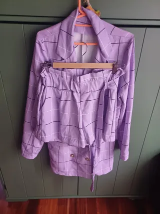 Conjunto de americana y shorts con estampado de cuadros nuevo. - Americana con solapas. - Shorts con cinturón. - Cierre de botones en la americana. Es elástico