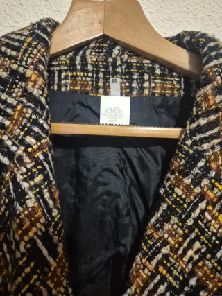 Chaqueta de estilo vintage con un diseño tejido en múltiples colores. Medidas ancho 64 x 68 largo - Tejido texturizado con hilos de varios tonos. - Cierre de botones al frente. - Bolsillos de solapa en la parte inferior.