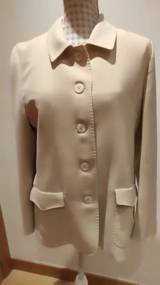 Americana de excelente calidad en color beige. Un clásico que no puede faltar en tu armario.Discreta, cómoda y versátil Ideal talla 44 pero ojo! Mejor mira medidas! - Diseño elegante y atemporal. - Cuatro botones frontales. - Dos bolsillos delanteros con solapa.