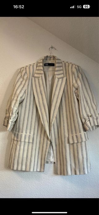 Americana de la marca Zara con un diseño de rayas verticales Muy poco uso - Color principal beige con rayas negras. - Diseño de solapa. - Mangas tres cuartos con detalle de vuelta. - Dos bolsillos delanteros.