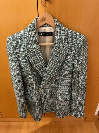 Americana de Zara con un diseño tweed muy elegante. - Tejido texturizado en tonos verdes y blancos. - Corte clásico. - Cierre de botones.