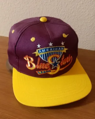 Gorra de béisbol con diseño de American Blue Star. - Visera de color amarillo. - Corona de color morado. - Detalle de estrellas bordadas. - Cierre ajustable.