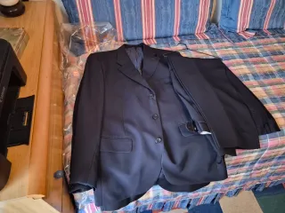 Talla 52,nueva,todavia conserva el plastico unido a la chaqueta de los botones de repuesto, bolsillo interior con botón de cierre para llevar documentos, llaves...,Tres bolsillos delanteros uno con cremallera, usada para reuniones de trabajo,Necesita limpieza,tintoreria