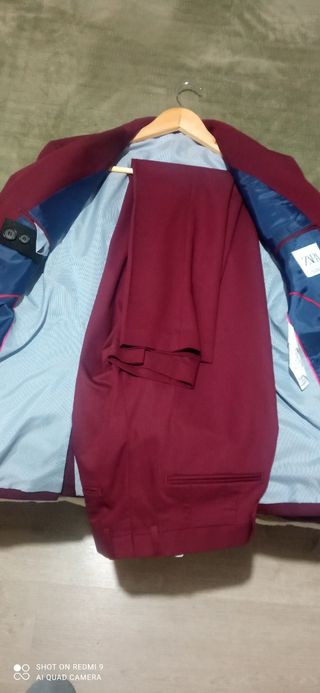 Traje de vestir en color granate. Incluye chaqueta y pantalón. - Chaqueta con un botón. - Bolsillo en el pecho con detalle. - Puño de la manga con tres botones. -Tiene un solo uso -Talla 48