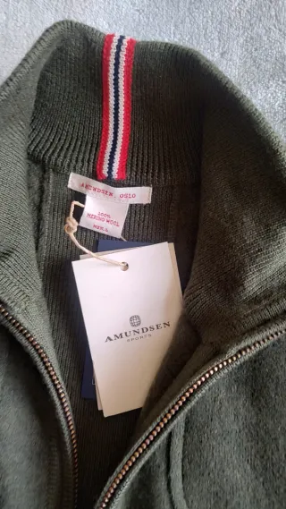 Chaleco de lana merino de la marca Amundsen. - Color verde. - Talla L. - Cierre de cremallera. - Cuello alto. - Dos bolsillos delanteros.