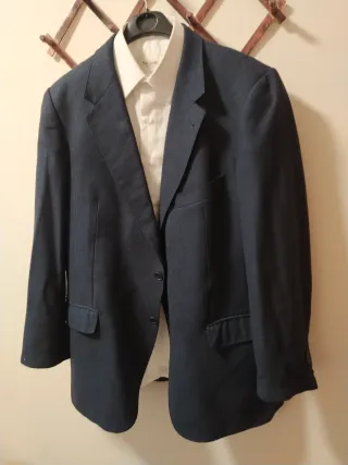 Americana clásica de vestir para hombre. - Color azul marino. - Talla 50. Vendo americana para hombre en color azul marino con un sutil microdibujo texturizado que le da mucha clase. Talla 50. Presenta solapas clásicas, cierre de dos botones y bolsillos laterales con solapa. Forro interior completo en perfecto estado. Una chaqueta muy versátil, ideal tanto para un look formal con camisa como para algo más casual con vaqueros. Muy cuidada. Hago envíos.
