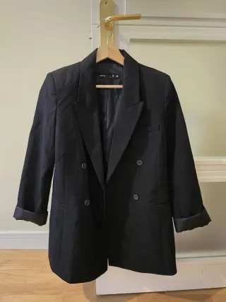 Americana de Zara en color negro, con un diseño elegante y moderno. Me la he puesto una vez, está en perfectas condiciones. - Cierre de doble botonadura. - Dos bolsillos frontales. - Botones dorados. - Cuello solapa.