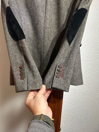 Vendo americana de hombre El Ganso, de corte clásico y elegante, muy versátil para vestir formal o combinar con looks más casuales. 🧥 Características: • Marca: El Ganso • Prenda: Americana / blazer de hombre • Talla: 46 • Exterior: 100% lana • Forro: 100% viscosa • Fabricada en Portugal • Limpieza en seco • Corte entallado • Tejido tipo tweed con estampado de cuadros • Color marrón con líneas en rojo y azul • Cierre de dos botones • Bolsillos con solapa 📏 Medidas aproximadas (ver fotos): • Hombro a hombro: ~40 cm • Ancho de pecho: ~50 cm • Largo total: ~70 cm 📌 Estado: muy buen estado, sin manchas ni daños. Ideal