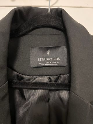 Americana Stradivarius talla L negra, con forro de raso en el interior Está en buenas condiciones excepto un roto en la manga, es en la costura, así que se puede arreglar si sabes coser.