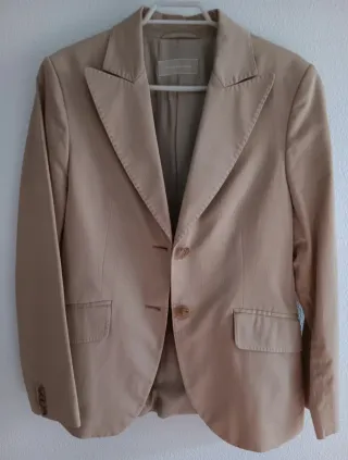 Americana beige clara de Massimo Dutti con solapa, 2 bolsillos delanteros y 2 botones para cerrar. Por la parte de atrás tiene una abertura en el medio y en la manga 4 botones de adorno. Talla 38. Largura 66 cm, Anchura de hombro 39 cm, Anchura de sisa a sisa 44 cm, Anchura de cintura 40 cm y Largura de manga 57 cm. Prácticamente nueva, utilizada sólo 1 día. A juego con pantalón recto con bolsillos traseros de adorno. Talla 40. Largura 93 cm, Anchura de cintura 41 cm, Anchura de muslo 28 cm, Anchura de rodilla 22 cm y Anchura en el bajo 22 cm. Utilizado 1 día también.