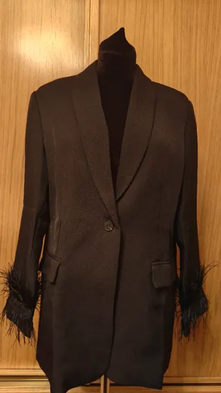 Elegante americana negra con un toque distintivo. - Detalle de plumas en los puños. - Cierre de un botón. - Solapas clásicas.