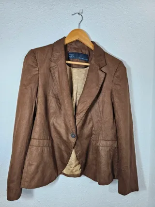 Blazer de Zara en color marrón chocolate con un acabado ligeramente texturizado como piel-ante que le da un toque sofisticado. Ideal tanto para oficina como para un look casual con vaqueros. 📐MEDIDAS EN LAS FOTOS📐 ¡Echa un 👁vistazo👁 a mi perfil y crea un lote! Ahorrarás dinero pagando un solo envío para varias prendas. 📦 ENVÍO RÁPIDO 📦