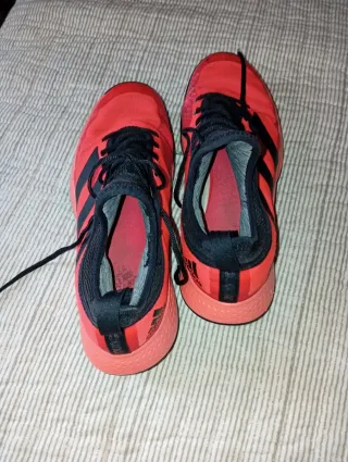Zapatillas deportivas Adidas en color naranja y negro. - Talla 8 americano, que es 41 y 1/3 - Diseño moderno y deportivo. Tienen unas manchitas a los lados que no salen, las suelas están como nuevas, sólo se han usado en gimnasio.