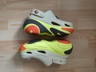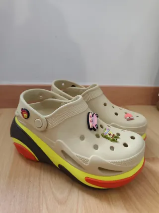 Zuecos unisex CROCS Bubble Crush U multicolor. Vendo por falta de uso. Están muy bien aunque lógicamente tienen uso. Vendo con 4 Jibbitz incluidos. Tallaje Crocs Americano: M6/W8 (Men / Women), equivalencia a la talla 38 EU. Zueco atrevido, estilizador, moderno y callejero. Plataforma alta de unos 69 mm de altura (medida desde el suelo hasta el apoyo del talón). Suela exterior de goma exagerada para más estilo y tracción, con formas redondeadas e "infladas" cómo las bubbles o burbujas. Detalles texturizados alrededor del talón, la puntera y el cuello. Personalizable con Jibbitz, en la parte superior y la tira trasera.