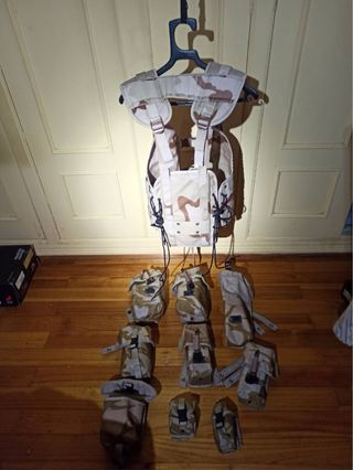 Chaleco táctico con múltiples bolsillos y compartimentos, diseñado para llevar equipo. Con nueve bolsos molle ,usados pero en muy buen estado, para combinar como quieras. También se puede usar como mochila de senderismo. - Diseño de camuflaje desértico. - Tirantes ajustables. - Cierre frontal con hebillas y correas