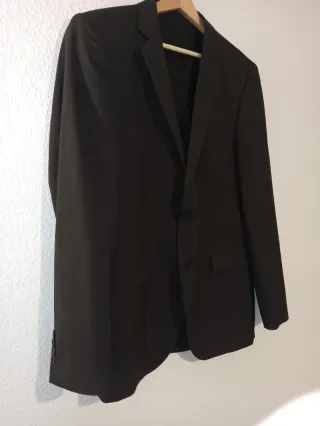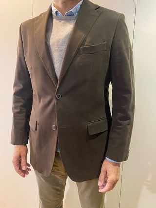 Americana de vestir en color marrón. - Medidas: ancho espalda 43cm, ancho pecho 55cm, manga 62cm y largo 70cm. - Cierre de dos botones. - Bolsillos frontales. - Forro interior.
