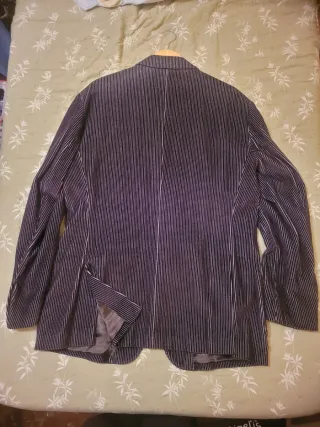 Vendo americana de pana de Adolfo Domínguez en talla 54, color entre marrón oscuro y morado berenjena con finas rayas verticales. Interior totalmente forrado en viscosa, muy cómoda y con buena caída. - Tejido exterior: 100% algodón (pana de canalé fino). - Forro: 100% viscosa. - Tres bolsillos exteriores tipo parche + bolsillo en el pecho y dos bolsillos interiores con botón. - Doble abertura trasera y cierre frontal de dos botones. - Estado muy bueno, como nueva; usada en contadas ocasiones y siempre guardada en percha. Ideal para looks casual-smart con vaqueros o chinos. Entrega en mano en Valencia o se envía por Wallapop.