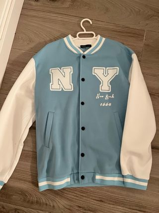 Chaqueta estilo americano con diseño NY y New York 1664. - Mangas blancas. - Cuerpo azul. - Puños y cuello a rayas.