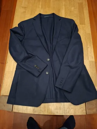 Americana de vestir para hombre. - Color azul marino. - Cierre de dos botones. - Bolsillos frontales con solapa. - Forro interior satinado. En tardevieja en Palau Alameda alguiem sr llevó una americana por error y dejó está que está perfecta pero es un poco pequeña.