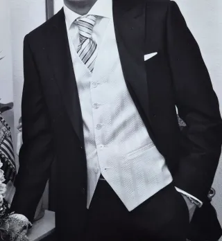 Elegante traje Pal Zileri para ceremonia, ideal para eventos especiales. Incluye chaqueta, chaleco y corbata. El traje está en excelentes condiciones y luce impecable. Talla 46 de americana, y de pantalon talla 40. - Chaqueta de corte clásico. - Chaleco a juego con detalles impecables. - Corbata de seda con diseño elegante.