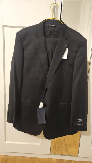 Chaqueta de vestir de corte clásico, ideal para ocasiones formales o eventos especiales. Prácticamente nueva, puesta en una ocasión. - Diseño de dos botones. - Solapa de muesca. - Bolsillos de solapa en la parte delantera. - Puños con botones. Se entrega con funda y percha