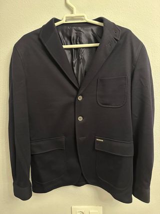 Americana de la marca Massimo Dutti. Es muy elegante y buena calidad. Al ser azul marino tiene los típicos signos de desgaste pero nada importante. Se aprecia en las fotos. - Diseño clásico y elegante. - Un botón frontal. - Dos bolsillos de solapa.