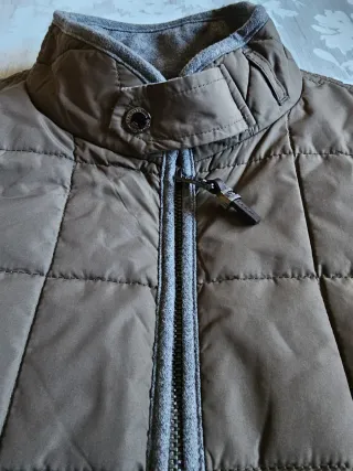 Chaleco acolchado de invierno con un diseño moderno. - Cierre frontal con cremallera. - Dos bolsillos laterales con cremallera. - Capucha integrada de color gris. - Puños y bajo elásticos.