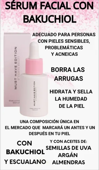 Sérum facial con Bakuchiol, ideal para pieles sensibles, problemáticas y acnéicas. Ayuda a borrar arrugas, hidratar y sellar la humedad de la piel. - Composición única en el mercado. - Con Bakuchiol y Escualano. - Contiene aceites de semillas de uva, argán y almendras.