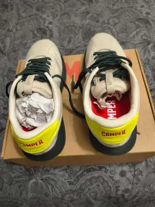 Zapatillas Camper Pelotas sin estrenar. Un diseño moderno y cómodo. - Color principal gris - Detalles en amarillo . - Cordones en color verde oscuro.