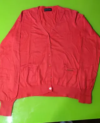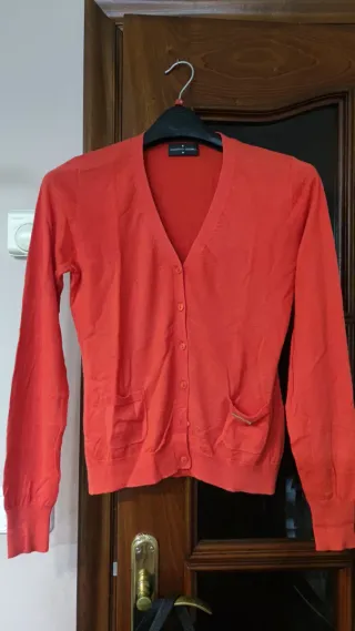 Chaqueta de punto fina con botones. - Cuello en V. - Dos bolsillos delanteros. - Logo metálico en uno de los bolsillos.