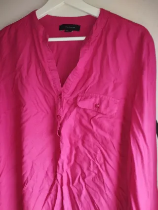 Preciosa camiseta de la marca Sfera en color rosa palo y talla L. Es una prenda suave y cómoda, ideal para el día a día. - Estampado con foto y texto. - Corte amplio y favorecedor. La parte delantera es gasa y la de atrás no ( ver foto).