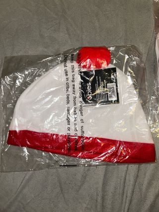 Lote de 9 gorros. Son gorros de disfraz con un pompón rojo en la parte superior y una banda roja en la base. - Gorros de disfraz. - Diseño con pompón. - Banda inferior roja.