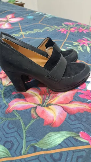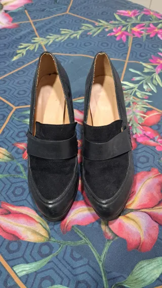 Elegantes zapatos de tacón en color negro. - Diseño de punta afilada. - Detalle de tira en la parte delantera. - Materiales combinados en piel y ante.