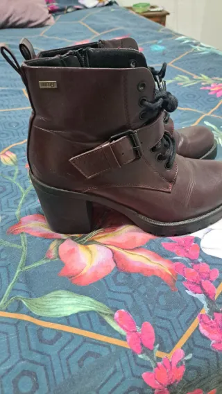 Botas de cuero estilo militar en color burdeos. Cuentan con cordones negros para un ajuste seguro y una hebilla decorativa. - Material exterior: Cuero - Cierre: Cordones y hebilla - Diseño: Botas de caña media