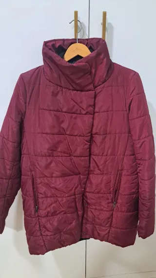 Chaqueta acolchada de color rojo, con cuello alto y cierre cruzado. Tiene la cremallera rota - Diseño acolchado. - Cuello alto. - Cierre cruzado.