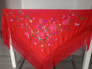 Elegante mantón de flamenca con un precioso bordado floral. - Diseño triangular. - Adornado con flecos. - Elaborado con detalles intrincados.