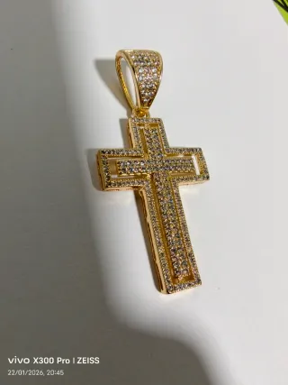 Elegante colgante con forma de cruz, adornado con pequeñas brillantes que le dan un brillo especial. - Diseño detallado. - Acabado en tono dorado.