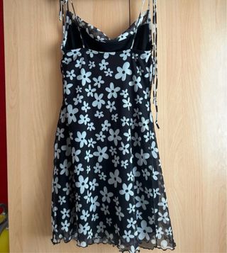 Vestido corto con estampado de flores blancas sobre fondo negro. - Diseño con tirantes finos. - Escote drapeado. - Bajo con acabado festoneado.