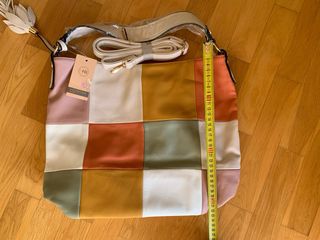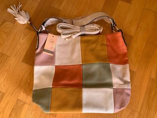 Bolso de la marca Herbosa, sin estrenar. Presenta un diseño patchwork con diferentes colores. - Incluye asa larga ajustable. - Adorno de flecos en uno de los laterales.