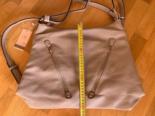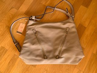 Bolso de mano o de hombro de la marca Herbosa, en color beige y sin estrenar. Tiene un diseño moderno con dos bolsillos frontales con cremallera. - Material: Polipiel. - Cierre principal con cremallera. - Correa ajustable y extraíble. - Dos bolsillos exteriores con cremallera. - Forro interior.