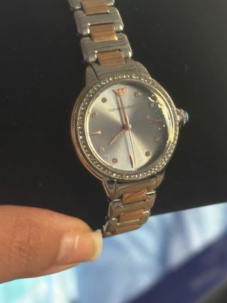 Elegante reloj de Emporio Armani con un diseño bicolor que combina tonos dorados y plateados. Su esfera presenta detalles brillantes alrededor del bisel. - Bisel adornado con pequeñas piedras. - Combinación de eslabones plateados y dorados en la correa.