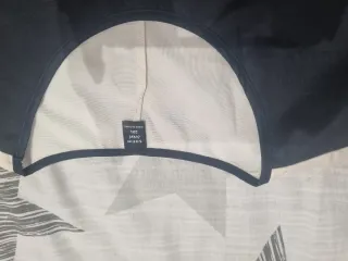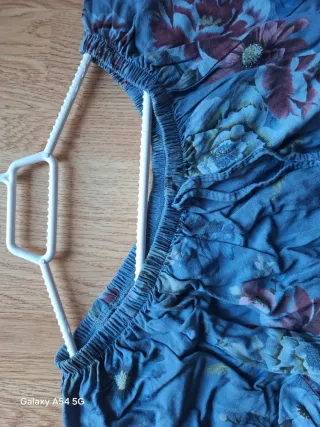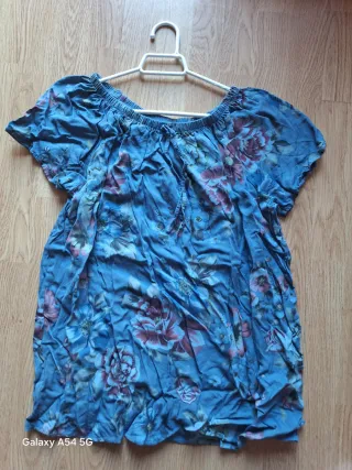 Blusa fina con un estampado de flores grandes sobre un fondo azul. - Diseño con escote elástico. - Mangas cortas. - Cierre de cordón en el escote.