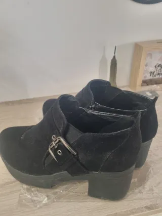 Botines negros con detalle de hebilla metálica. - Diseño de caña baja. - Cierre de cremallera lateral. - Suela gruesa y tacón cuadrado.