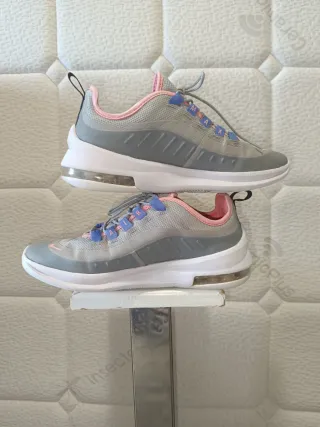 Zapatillas deportivas Nike Air Max Axis en tonos grises con detalles en rosa. - Diseño moderno y cómodo. - Suela con amortiguación visible. - Cierre con cordones.