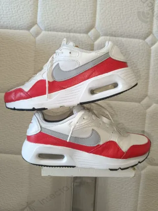 Zapatillas deportivas Nike Air Max SC con un diseño moderno y llamativo. - Combinación de colores rojo y blanco. - Detalle de Swoosh gris en el lateral. - Unidad Air visible en la suela.