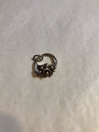 Anillo charro antiguo para niña, con un diseño floral en la parte superior. - Elaborado en plata. - Detalle de pequeñas bolitas alrededor del diseño central.