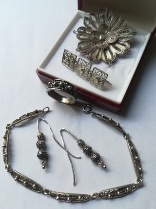 Conjunto de joyas antiguas de plata con intrincados diseños de filigrana. Larvo pulsera 20 cm. L. Broches 4.50. 3.60 - Broche floral. - Pendientes. - Pulsera. - Anillo.el anillo mide 18.15 mm.